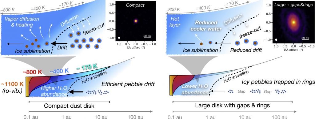 Here's how pebble drift works. In compact disks like the one on the left in the above image, ice-covered pebbles drift inward toward the warmer region closer to the star unimpeded. When they cross the snow line, or astrophysical frost line, their ice sublimates to vapour. That delivers a large amount of water to the still-forming, rocky planets nearer the star. The right side of the above image shows an extended disk with rings and gaps likely created by large planets that are still forming. These rings have higher pressure than the gaps. As the ice-covered pebbles drift inward, more of them are stopped by the rings in the protoplanetary disk and trapped there. So fewer icy pebbles make it across the snow line to deliver water to the inner regions.