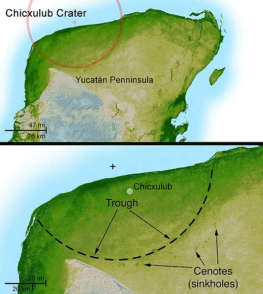 Researchers now think that the asteroid strike that created the K-T boundary was probably the Chicxulub Crater. This is a massive impact crater buried under Chicxulub on the coast of Yucatan, Mexico. The crater measures 180 kilometers across, and occurred about 65 million years ago.