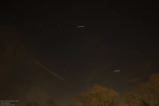 Also, another poorly understood meteor shower peaks on May 8th: the Eta Lyrids. This also seems to be a new stream, laid down by the 198- passage of Comet IRAS-Araki-Alcock, just 0.03 astronomical units (AU) or only 4.6 million kilometers from the Earth.