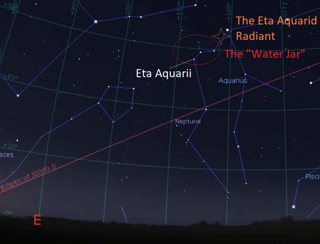The Eta Aquarids appear to radiate from a point (known as the shower's radiant) just a few degrees west of the +4th magnitude star Eta Aquarii (hence the shower's name) located in the astronomical constellation of Aquarius the Water-Bearer. The radiant is also very near the famous "Y-shaped" asterism in Aquarius of Um the Water Jar. Aquarius also hosts another elusive meteor shower: the July Delta Aquarids. The parent comet for the Eta Aquarids is none other than that most famous comet of them all, 1/P Halley. In fact two, debris trails from Halley's Comet intersect the orbit of the Earth, and the comet also gives us the October Orionids in the Fall.