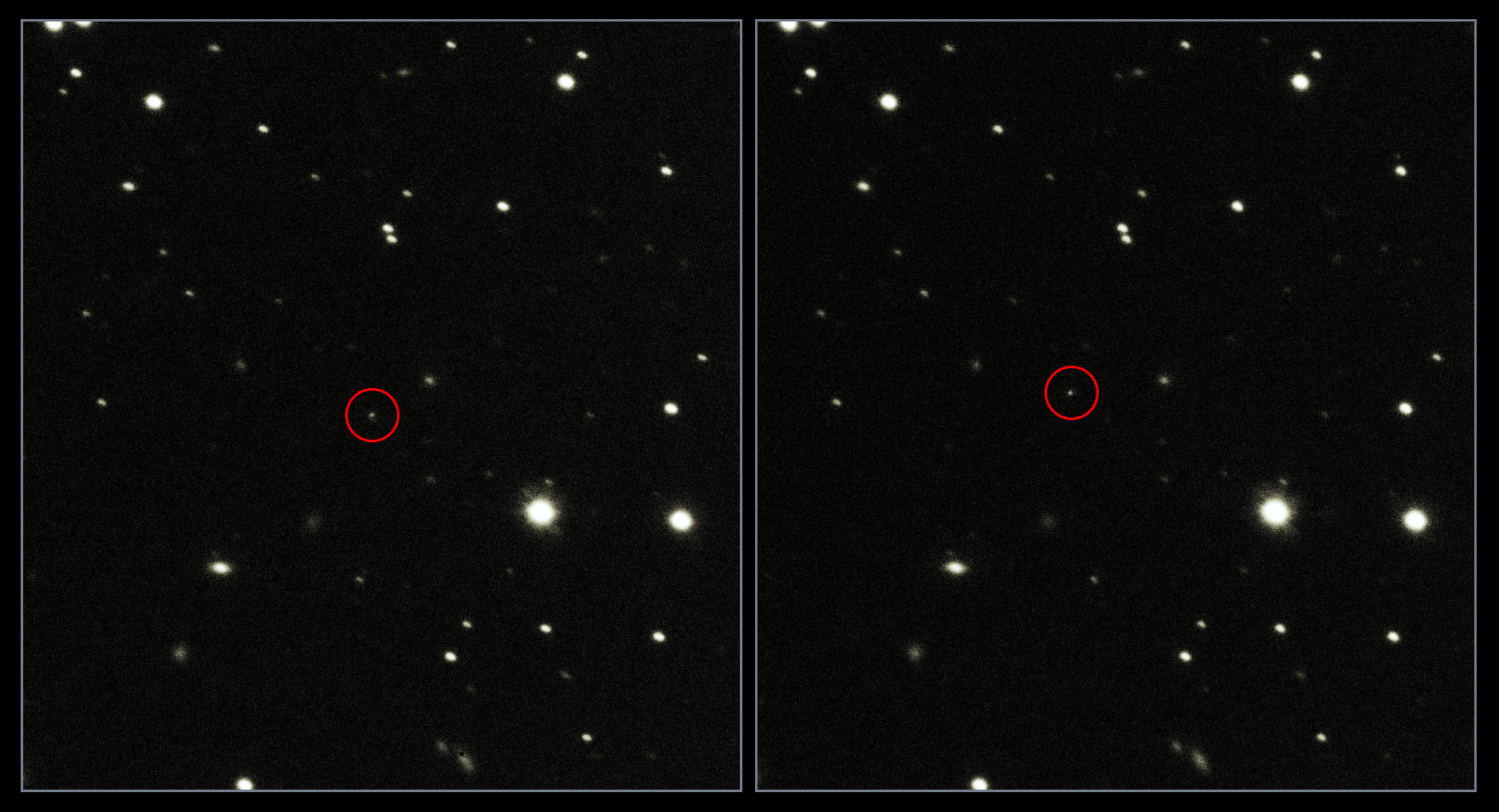 ) atop Cerro Paranal in Chile, one of the supporting observatories in the GBOT campaign. The images were taken with the 2.6-meter Survey Telescope's 268-megapixel OmegaCAM on Jan. 23, 6.5 minutes apart. With just the reflected sunlight off its circular sunshield, the distant spacecraft is about a million times fainter than what your eyes could see unaided.