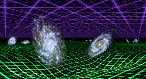 New results from NASA's Galaxy Evolution Explorer and the Anglo-Australian Telescope atop Siding Spring Mountain in Australia confirm that dark energy (represented by purple grid) is a smooth, uniform force that now dominates over the effects of gravity (green grid). Image credit: NASA/JPL-Caltech[/caption]