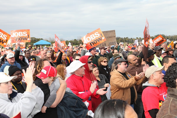 "This is a time to build, a time to be innovative, a time to keep people working in the jobs they were trained to do," he continued. "We are here today on this raining, cloudy and misty day to remind our leaders in Congress that this community is worth fighting for and these jobs are worth holding onto. We are not here to lay blame on anyone but to value the pride of this community and the work that we do in it. This is an example that we are willing to do to whatever we can to save our community and save our jobs." [caption id="attachment_58112" align="aligncenter" width="300" caption="Rally in Titusville, FL. Image credit: Alan Walters, awaltersphoto.com. Used by permission"]