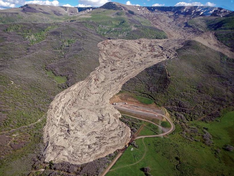 - The landslide debris glides over a layer of trapped air, reducing friction.