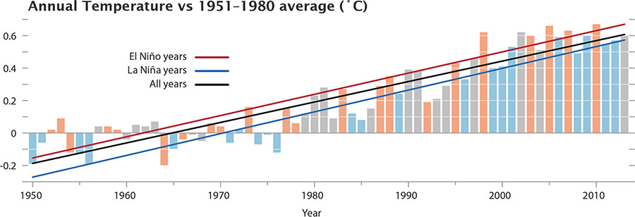 2013 tied with 2009 and 2006 for the seventh warmest year since 1880, continuing a long-term trend of rising global temperatures, while