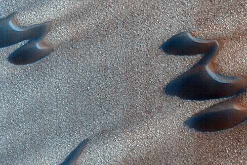 Small ripples are also visible, and the small bright spots are the remnants of the seasonal carbon dioxide polar cap that coats this area in the winter.