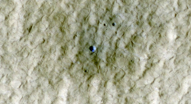 The crater is at a latitude of 44 degrees North and is itself located on the ejecta of a larger crater. The image was acquired in early summer, when frost at this latitude is not expected. That's why the HiRISE science team believes the bright blue material in this false-color color image is sub-surface ice that was exposed by the impact.