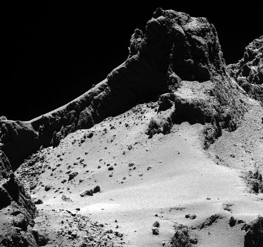 Close-up of a curious surface texture nicknamed 'goosebumps' taken with the OSIRIS narrow-angle camera. The bumps are approximately 9 feet across, extending over regions greater than 300 feet. They're seen on very steep slopes such as in this pit and exposed cliff faces, but their formation mechanism is yet to be explained. Credit: ESA/Rosetta/MPS for OSIRIS Team MPS/UPD/LAM/IAA/SSO/INTA/UPM/DASP/IDA[/caption]
