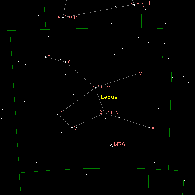 Now keep those binoculars and telescopes handy as we drop a little less than four degrees south/southwest (a binocular field) of Beta and go for Messier 79 (RA 05:24.5 Dec -24:33). This 7th magnitude globular cluster was originally discovered by Pierre Mechain and later added to the Messier Catalog. Located about 40,000 light years from our solar system, the huge ball of stars spread across 118 light years of space an incorporates tens of thousands of distant suns. What's unusual about it? Chances are, M79 is an import to our Milky Way Galaxy. From what we can tell through recent studies, this globular cluster may have actually belonged the the Canis Major dwarf galaxy at one time and became part of our galaxy through a galaxy collision! For double star fans, look another half degree southwest where you'll see fifth magnitude ADS 3954 and its seventh magnitude companion. A nice same field bonus!