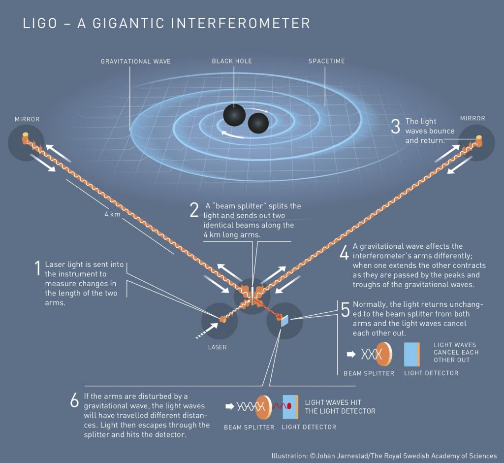 LIGOmeasures this distance by a process known as laser interferometry. Light has wavelike properties, so when two beams of light overlap, they combine like waves. If the waves of the light line up, or are "in phase," then they superpose to become brighter. If they are out of phase, they cancel out and become dimmer. SoLIGOstarts with a beam of light that in phase, and splits it, sending one beam along one arm ofLIGO, and one along the other. The beams each bounce off a mirror 4 kilometers away, then return to combine into a single beam seen by a detector. If the distance of a mirror changes, so does the brightness of the combined light.