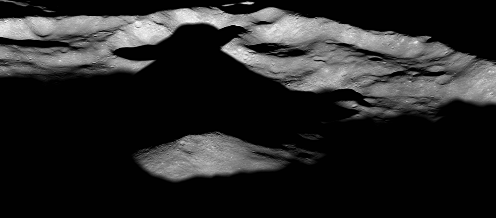 Below you can see a closeup of the central peak of Icarus crater rising out of the shadows to greet a new lunar day.