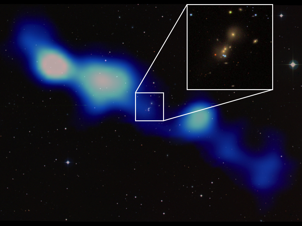 Cataloged as UGC 09555, the parent galaxy system is located some 750 million light years from our solar system. Its central galaxy had been studied before and was known to have a flat radio spectrum - a signature of giant radio galaxies. Astronomers speculate when the trio interacted, material was released - spreading out over millions of light years and releasing very low radio frequencies. It's a source that's either very powerful, or it's very old.