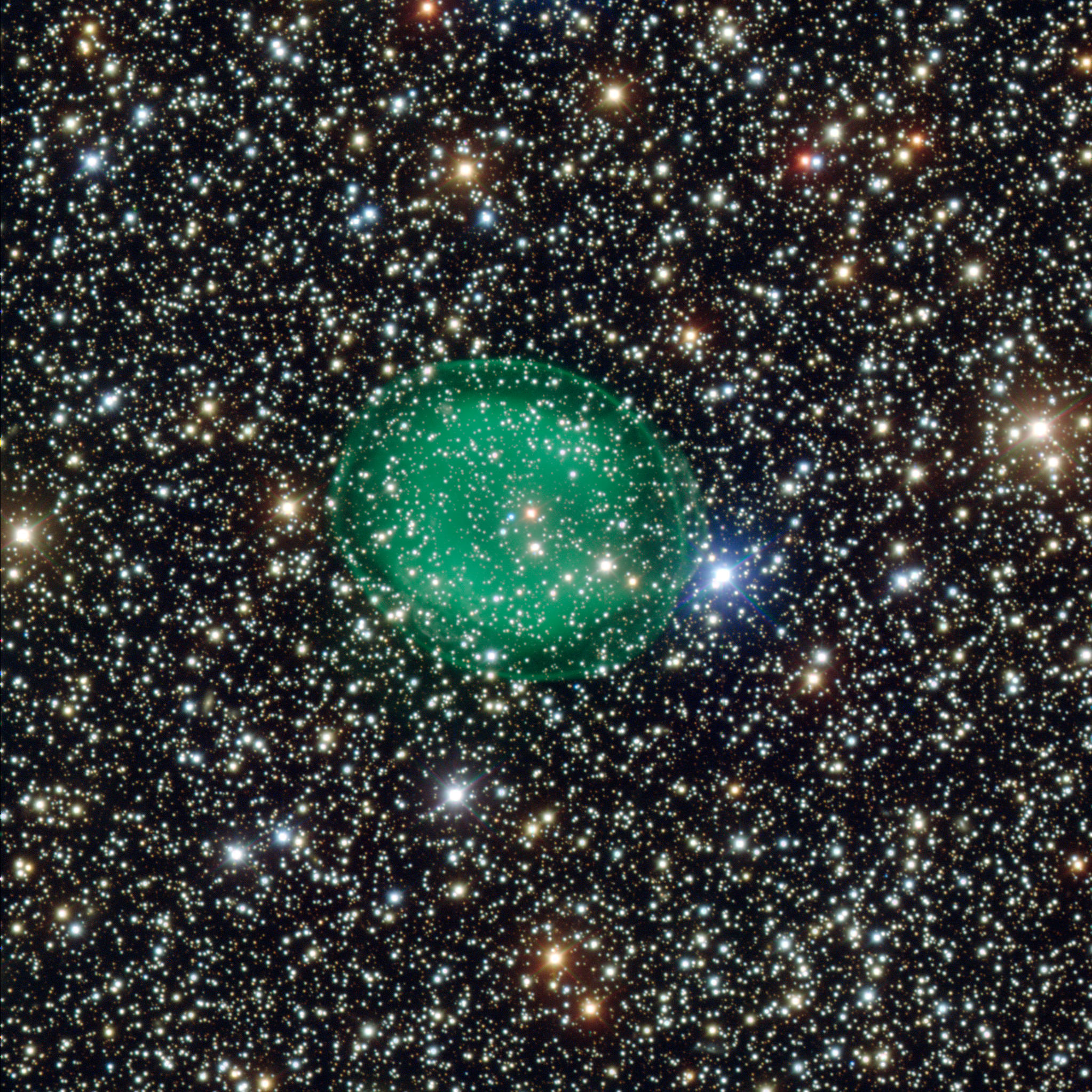 Located on Cerro Paranal in the Atacama Desert of northern Chile, the ESO's Very Large Telescope was busy using the FORS instrument (FOcal Reducer Spectrograph) to achieve one of the most detailed observations ever taken off a lonely, green planetary nebula - IC 1295. Exposures taken through three different filters which enhanced blue light, visible green light, and red light were melded together to make this 3300 light year distant object come alive.