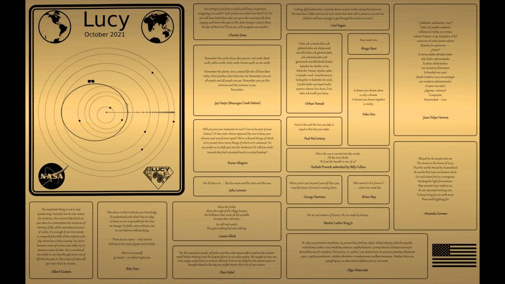 Lucy takes its name from the 3.2-million year old Lucy hominid fossil, which in turn was named from the Beatles song 'Lucy in the Sky With Diamonds.' The naming alludes to the fossils of planetary formation sought out by planetary researchers in the Jupiter Trojan asteroids. Not only does the spacecraft's L'TES instrument carry a disc made of lab-grown diamonds, but it also has a plaque with poems, speeches and quotes from Earth.