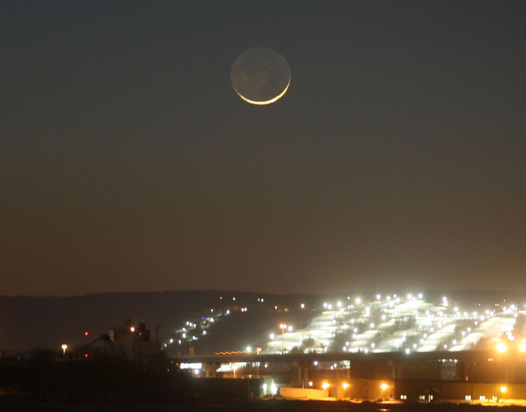 . Sunlight reflected off Earth's globe faintly illuminates the portion of the Moon not lit by the Sun. Because it's twice-reflected, the light looks more like twilight. Ghostly. Binoculars will help you see it best.