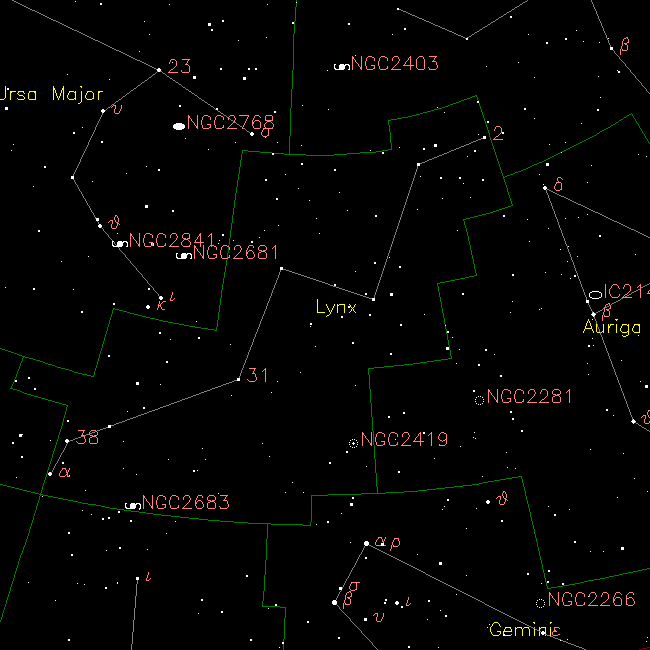 Located north of the ecliptic plane, the dim constellation of Lynx was first introduced in the 17th century by Johannes Hevelius in 1687 and later recognized as one of the 88 modern constellations by the International Astronomical Union. According to legend, Lynx is so named because it is a relatively faint constellation, and one would supposedly need the eyes of a lynx to see it. Covering 545 square degrees of sky, it ranks as the 28th largest constellation. Although only 4 main stars form its asterism, Lynx contains 42 stars with Bayer Flamsteed designations. It is bordered by the constellations of Ursa Major, Camelopardalis, Auriga, Gemini, Cancer, Leo and Leo Minor. Lynx is visible to all observers located at latitudes between +90° and ?55° and is best seen at culmination during the month of March.