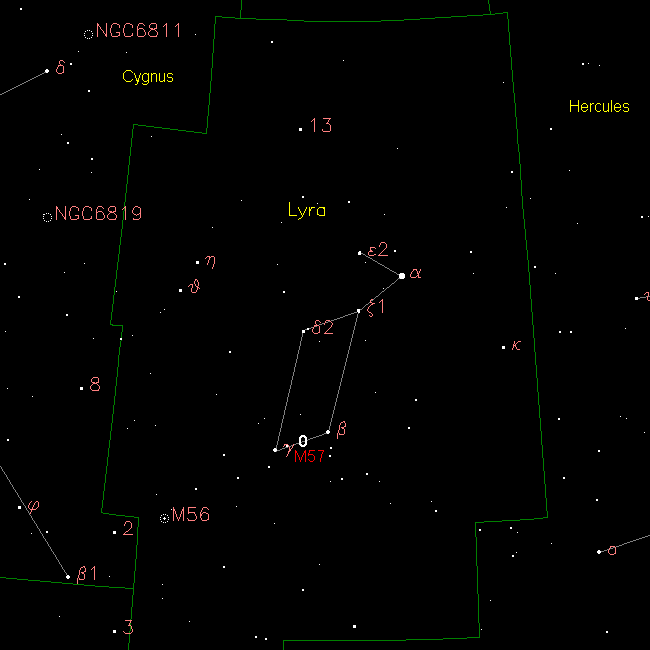 Ready to get Messier? The go directly between Gamma and Beta Lyrae to grab the "Ring"... The only and only planetary nebula - M57. Discovered by French astronomer Antoine Darquier in 1779, the Ring Nebula was cataloged later that year by Charles Messier as M57 (RA 18 53 35 Dec +33 01 45). In binoculars the Ring will appear as slightly larger than a star, yet it cannot be focused to a sharp point. To a modest telescope at even low power, Messier 57 turns into a glowing donut against a wonderful stellar backdrop. The accepted distance to this unusual structure is about 1,400 light-years, and how you see the Ring on any given night is highly dependent on conditions. As aperture and power increase, so do details, and it is not impossible to see braiding in the nebula's structure with scopes as small as 8" on a fine night, or to pick up the star caught on the edge in even smaller apertures. Like all planetary nebulae, seeing the central star is considered the ultimate achievement in viewing. The central itself is a peculiar bluish dwarf which gives off a continuous spectrum, and might very well be a variable. At times, this shy, near 15th magnitude star can be seen with ease with a 12.5" telescope, yet be elusive to even 31" in aperture weeks later. No matter what details you may see, reach for the "Ring" tonight. You'll be glad you did.