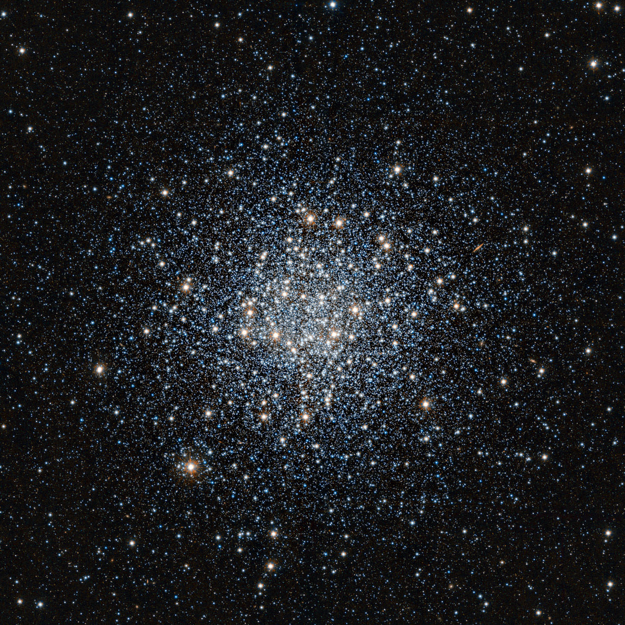 Globular clusters contain vast numbers of stars clumped together in a tight area. In the case of M55, there are about 100,000 stars grouped up within a sphere only 100 light-years across. Astronomers know that globular clusters are old, almost as old as the Universe itself. In fact, for the longest time, astronomers calculated the age of globular clusters to be
