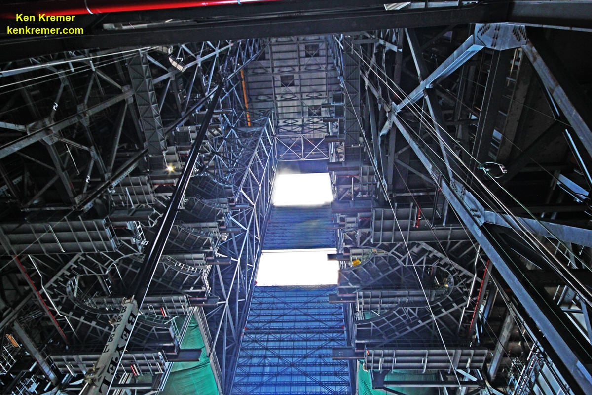 Looking up to the 5 pairs of newly installed massive work platforms inside High Bay 3 of the Vehicle Assembly Building on July 28, 2016. Heavy duty cranes are used to install the new platforms which will enable access to assemble NASA's SLS rocket at KSC in Florida. Credit: Julian Leek[/caption]