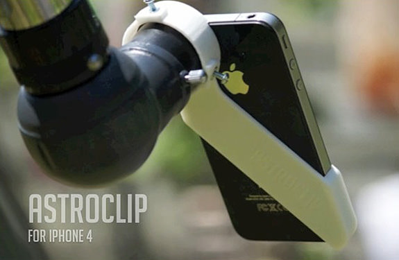 They say necessity is the mother of invention, and if you've ever tried to take a picture through a telescope with your iPhone you'll understand the necessity behind this invention: the AstroClip, an ingenious bit of injection-molded awesomeness that mounts an iPhone 4 onto any standard 1.25" telescope eyepiece, keeping it stable and centered with the camera lens. I think this is a great idea and would certainly get one... that is,
