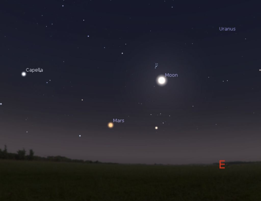 Note that Mars is closest to the Earth a week prior to opposition. This occurs for two reasons: while the Earth is moving towards perihelion in January (that is, we're moving towards the Sun in December, but away from Mars), the Red Planet is doing the opposite, headed towards aphelion on May 30, 2023, just under six months after this week's opposition. This makes up for the 900,000-odd kilometer difference as Mars is 0.55 Astronomical Units (AU, or 81.5 million kilometers) from Earth on the 1st, but sits 82.4 million kilometers from Earth at opposition.