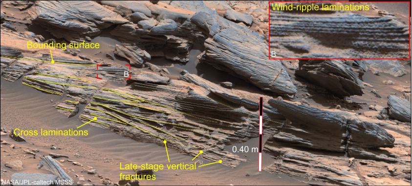 MSL Curiosity slowly worked its way up Mt. Sharp, studying the rocks at different elevations as it ascended. As expected, it found younger rocks the higher it went. Eventually, it reached the Stimson formation. The Stimson formation is the remnant of an ancient windborne desert dune field.