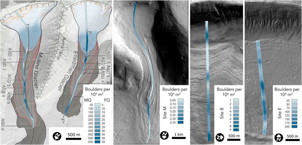 In their paper, they write, "Supraglacial rocky debris on LDAs is thought to result partially from the sublimation of LDA ice that releases fine sediments (25 cm) that were entrained in the LDA accumulation zone and partially from rafting of large (1 m) rockfall that travels supraglacially, in cases, forming longitudinal rocky zones analogous to medial moraines.