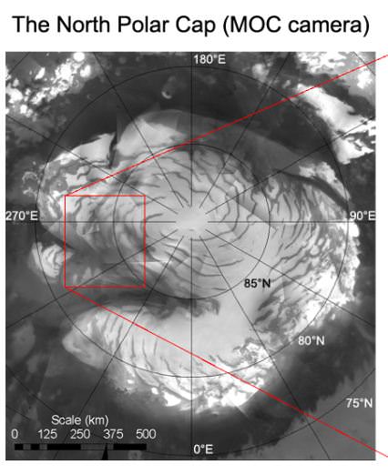 The second region analyzed by the team is located in the spiral troughs structure of the North permanent cap. A similar situation was observed but the carbon dioxide ice re-appeared very quickly here after its initial disappearance.