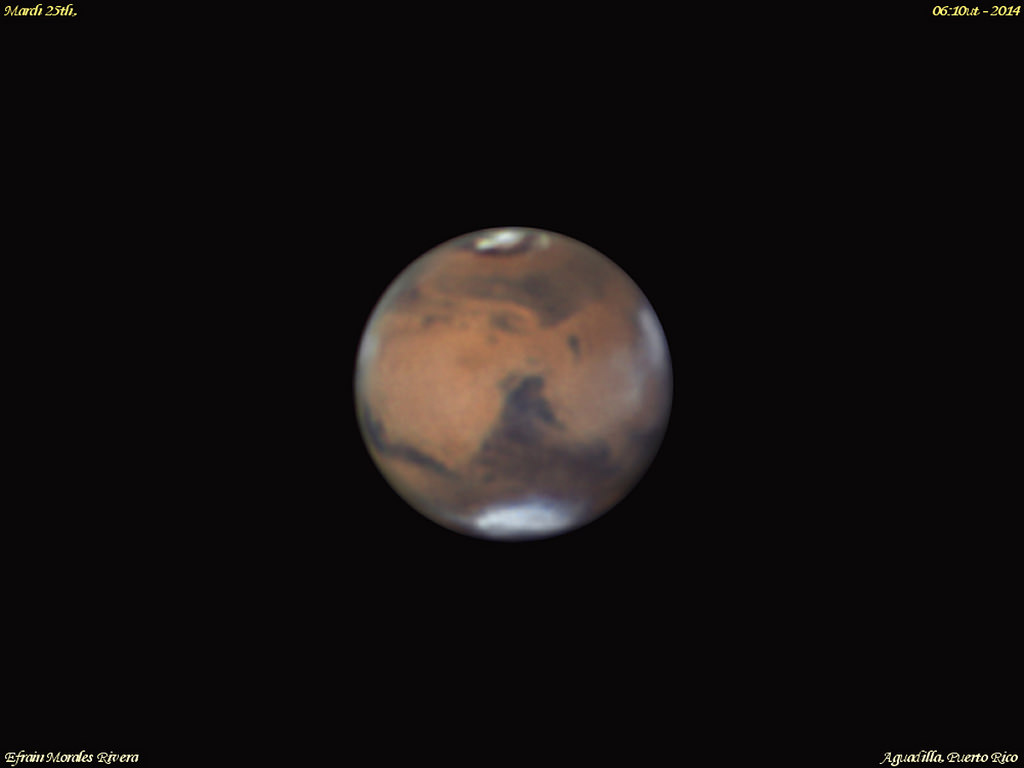 that have been the hallmark of the Mars opposition of 2014. These are also apparent visually at the eyepiece. It's worth staying up a bit towards local midnight to observe and image Mars, as it transits at its maximum elevation — and is above the murk of the sky low to the horizon — right around this time.