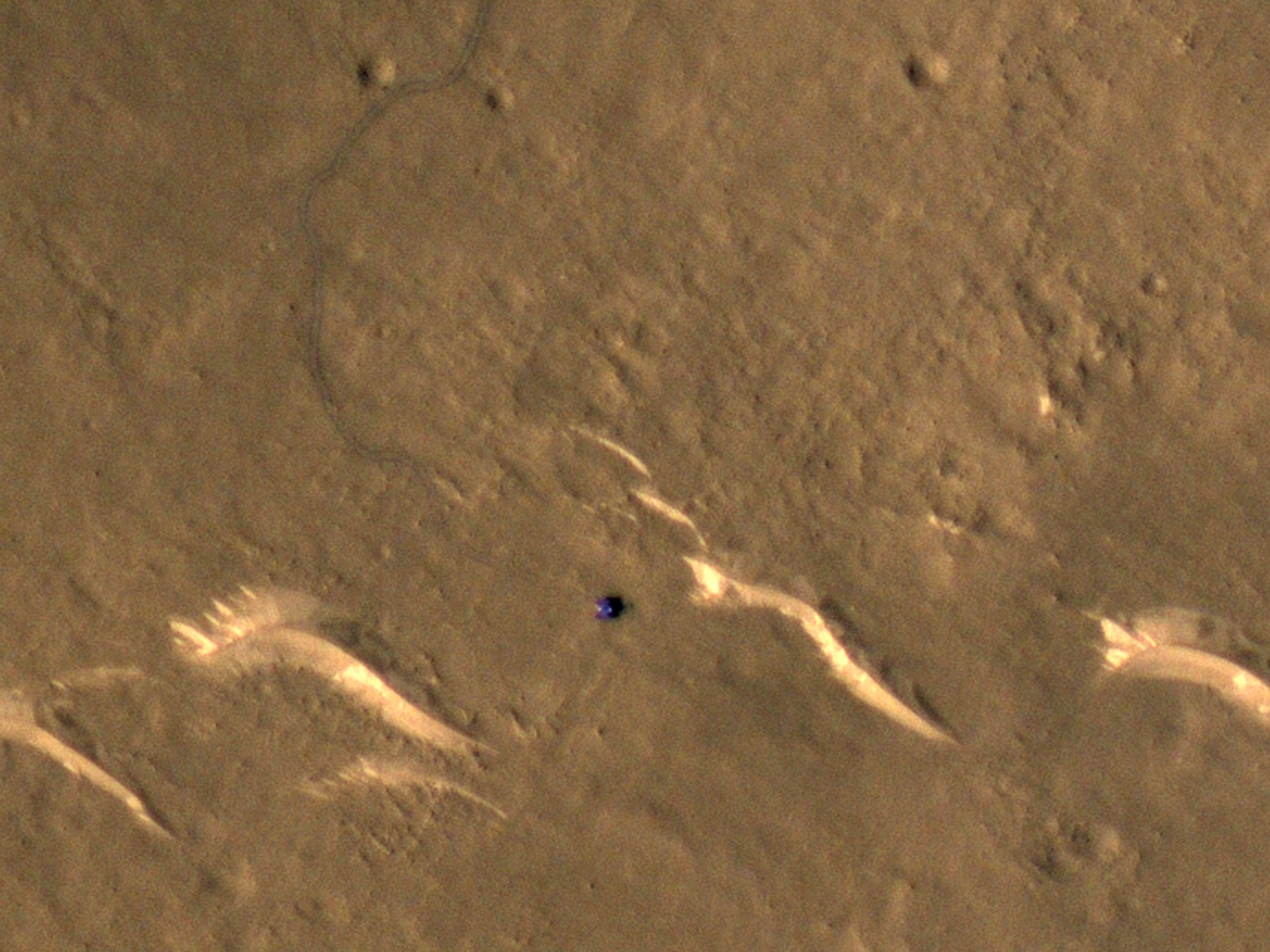 China's Tianwen-1 lander and Zhurong rover touched down on the Martian plain Utopia Planitia on May 14, 2021 after spending about three months orbiting the Red Planet. While the Chinese Space Agency has shared images of the rover and lander (including a cute family portrait taken by a wireless remote camera), NASA's Mars Reconnaissance Orbiter has been following the rover's travels from above.