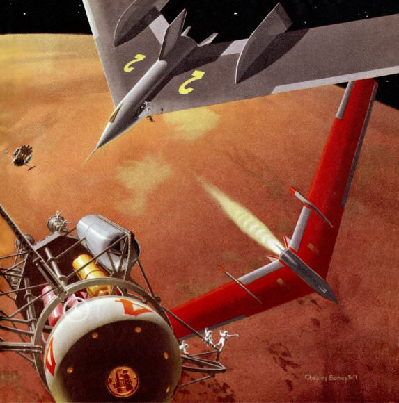 A rocket-powered glider descending towards Mars. Credit: Collier's[/caption]