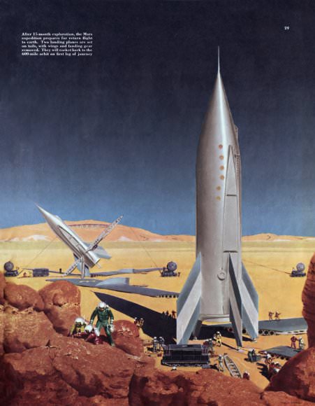 Once they reached the Red Planet, they would use powerful telescopes to scan the Martian landscape and search for safe and scientifically interesting landing spots. The first landing would happen at one of the planet's polar caps, which Von Braun figured was the only guaranteed flat surface for a landing.