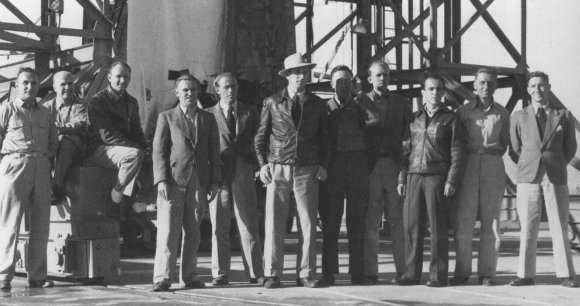 Von Braun and others standing in front a V-2 rocket engine at White Sands. Credit: U.S. Army/ Ordway Collection/Space Rocket Center[/caption]