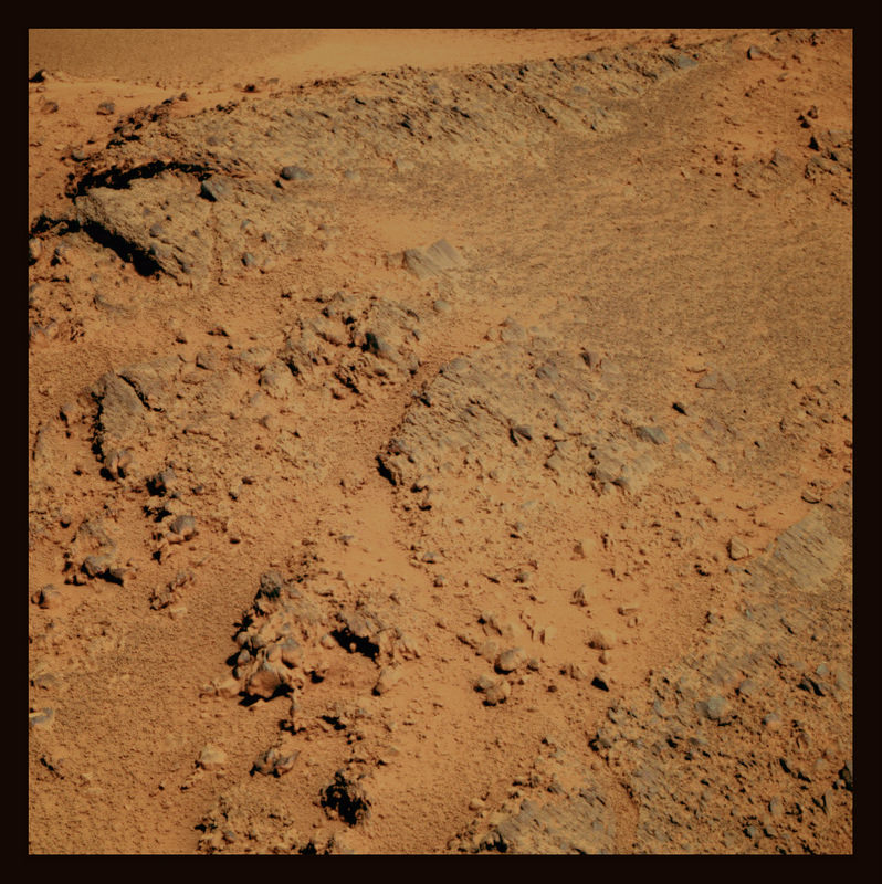 [caption id="attachment_91224" align="aligncenter" width="580" caption="The rock outrcopping called 'Homestake," with part of the Opportunity rover visible. Credit: NASA/JPL. Colorization courtesy Stu Atkinson. "]