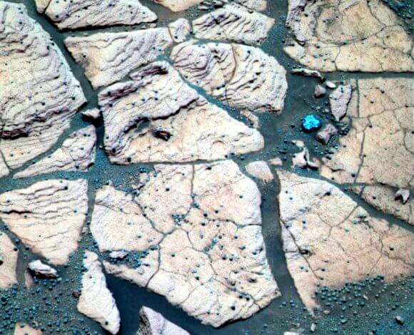 This false-color composite image was taken by the Mars rover Opportunity. It shows rocks termed "blueberries" which are geologic concretions that form in the presence of water. It also shows sedimentary rock which forms in the presence of water. Image credit: NASA/JPL/Cornell [/caption]