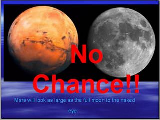 For criminy's sake, I just got one of those "Mars as big as the full Moon in August" emails. For one more time: this is completely false and it couldn't possibly happen. Besides, in 2009 Mars is all but unobservable until the end of the year, and even next year it won't be much better. So can we please see an end to these erroneous emails???