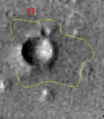 The image showing the centre of Beagle 2's landing ellipse also shows a 1 km wide crater. There is just an outside possibility that the lander could have touched down inside this crater, resulting in problems caused by steep slopes, large number of rocks or disruption to communication from the lander. This image is now available on the Beagle 2 and PPARC Web sites (see link on the right hand side).