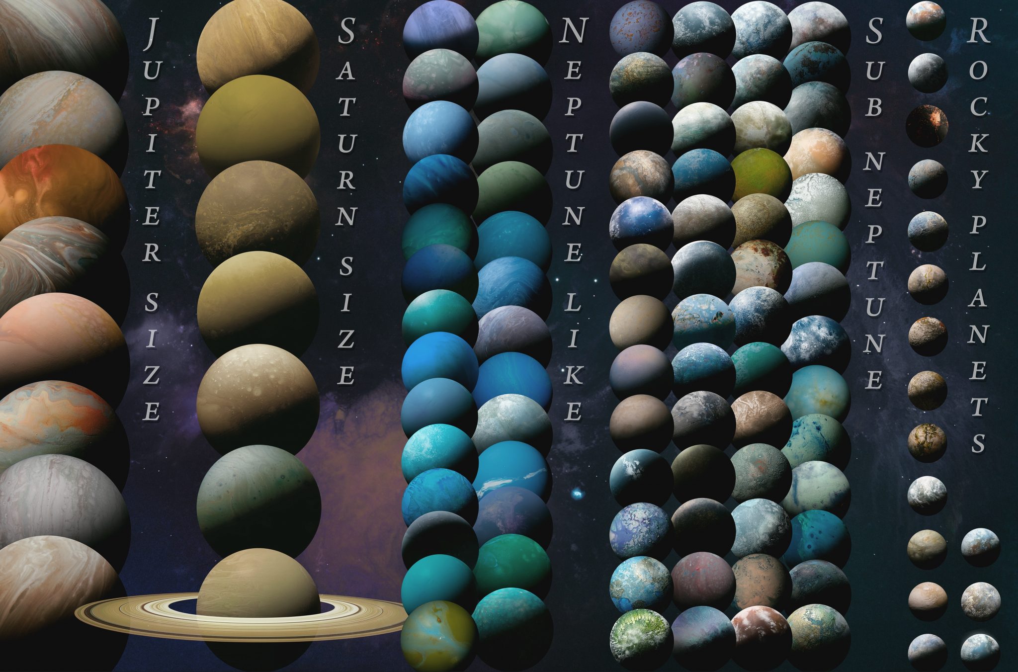 Artist's rendering of some of the exoplanets contained in the TESS-Keck Catalog.