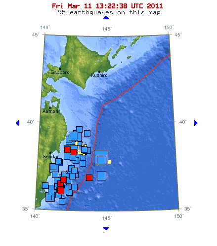 An 8.9-magnitude earthquake struck off the coast of northern Japan on March 11, one of the strongest to ever hit Japan. The massive quake has triggered tsunamis not only in Japan, but around the Pacific Basin. Walls of water and debris have inundated coastal areas of Japan, and tsunami warnings were issued for at least 20 countries and numerous Pacific islands, including coastal Russia, the western coast of Canada and the US, the Marcus Islands, Taiwan, Guam and the Hawaiian Islands, where a full coastal evactuation has been taking place throughout early Friday morning. Strong aftershocks, as strong as 6.5-magnitude continue to shake the region, (the latest U.S. Geological Survey map, above, shows 95 recent quakes in the area) and at least one nuclear power plant in Japan may be encountering problems. Images coming from Japan show widespread damage from both the quakes and the tsunamis.