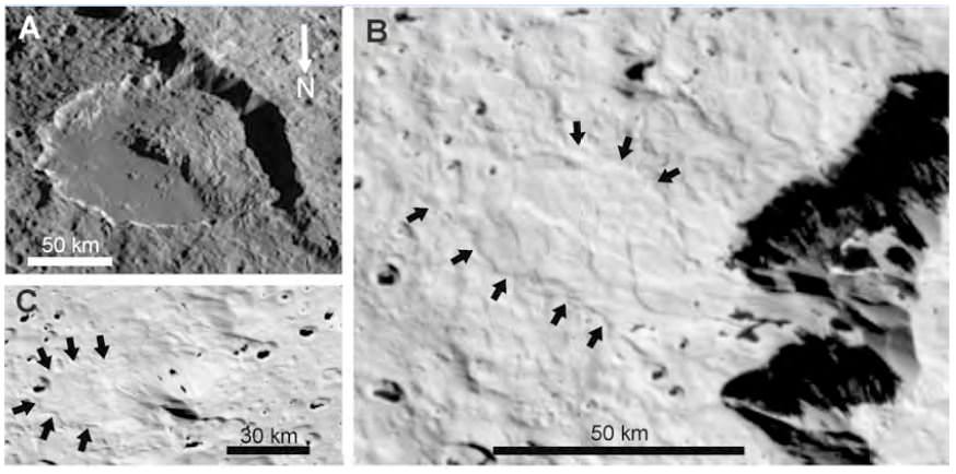 "There seems to be a necessity for a fluidization or liquid mechanism," McKinnon said. "If ice is warmed just enough it will become slippery," reducing the friction and cohesiveness of the crater or basin wall.
