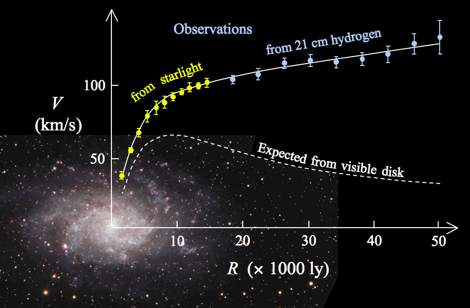 A major piece of the dark matter puzzle (though certainly not the only one, and this will be important later in the article) comes in the form of so-called galaxy rotation curves. As we watch stars wheel about in rotation around the center of their galaxies, by all rights the ones further from the center should be moving slower than the ones closer to the center. This is because most of the galactic mass is crowded into the core, and the outermost stars are far away from all that stuff, and by simple Newtonian gravity they should follow slow lazy orbits.