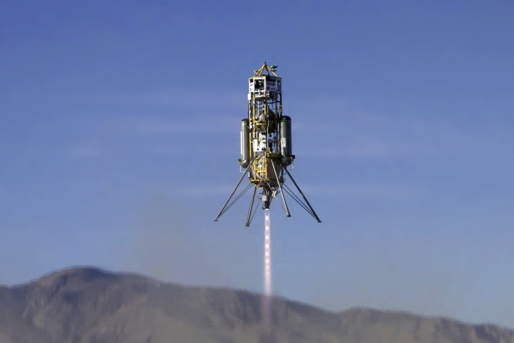 Masten Space Systems' Xombie rocket with Draper Laboratory's GENIE flight control system takes an untethered flight from the Mojave Air and Space Port. (Photo courtesy of Draper Laboratory)