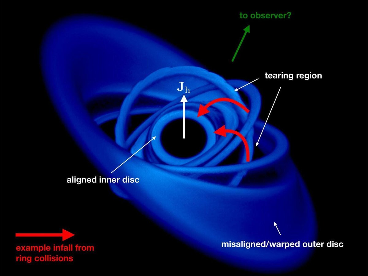 Astronomers assumed that these discs of in-flowing gas are in alignment with each other, like the planets on the ecliptic in our Solar System. But that's not always the case. Clouds of gas and dust can fall into the black hole from any direction, so there's really no reason that these accretion discs can't be misaligned. The question has been, how do misaligned discs affect the in-fall of gas into a black hole?