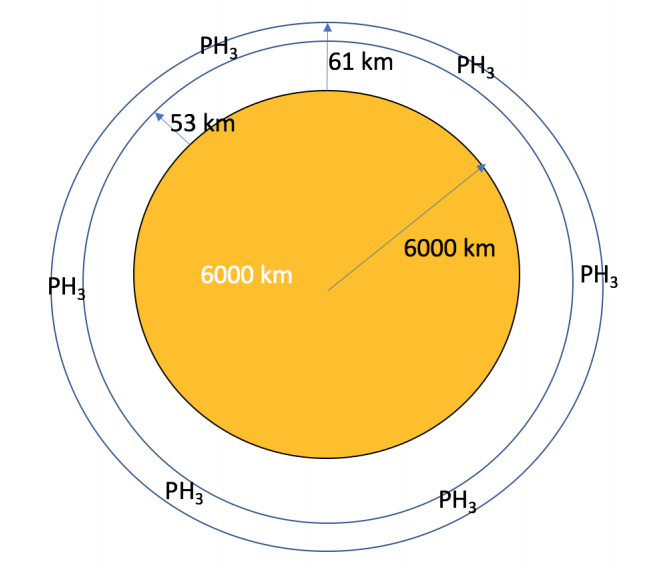 First hey had to find the volume of phosphine present in Venus' atmosphere. There are 20 parts per billion in an atmospheric layer 8 km thick, between 53 and 61 km (33 to 38 mi) above the planet's surface.