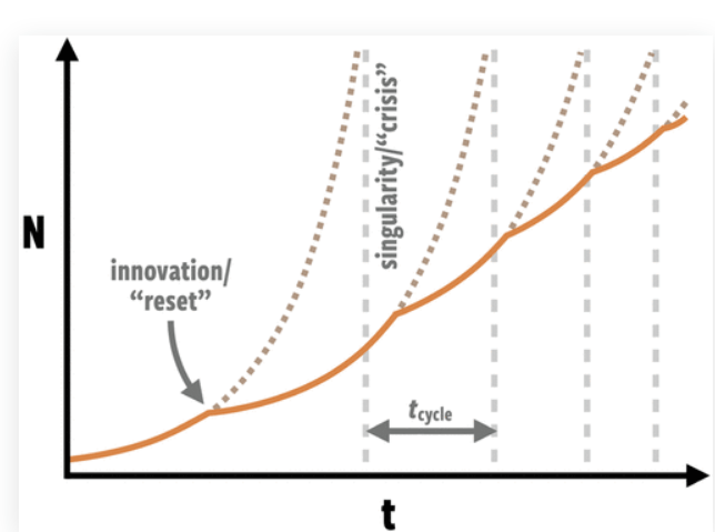 So tension sits at the heart of the civilization as it reaches global status. Singularities arise and are overcome by resets or innovations. But what if the time between these critical singularities keeps shrinking? At that point, the planetary civilization "... will face an 'asymptotic burnout', an ultimate crisis where the singularity-interval time scale becomes smaller than the time scale of innovation."
