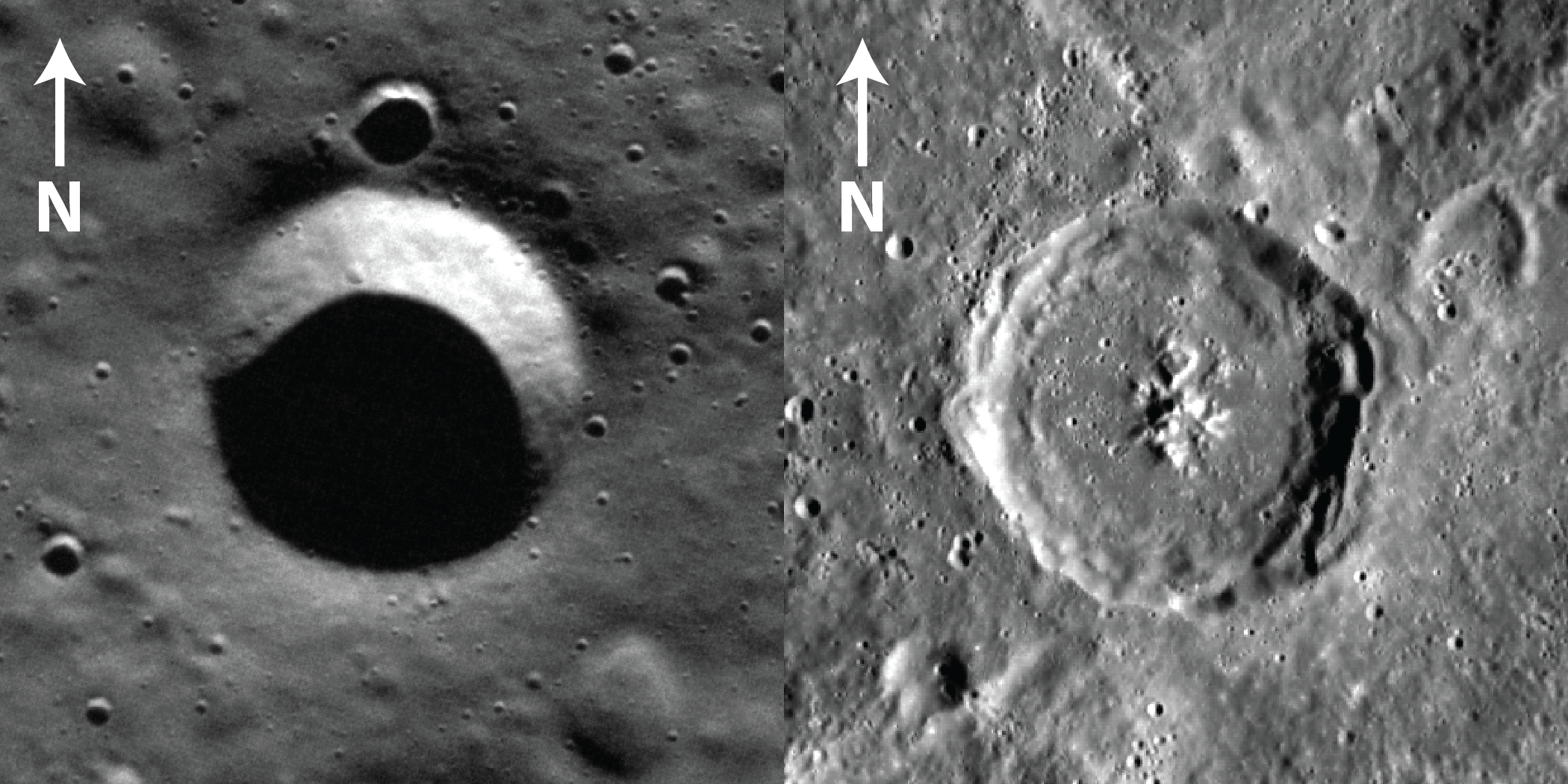 [caption id="attachment_87499" align="aligncenter" width="503" caption="An example complex crater on Mercury, ~ 55 km in diameter and centered near 63.5°N, -139ºE, that has been imaged by MDIS (left) and profiled by MLA (right). A slightly larger complex crater lies along the MLA profile to the south."]