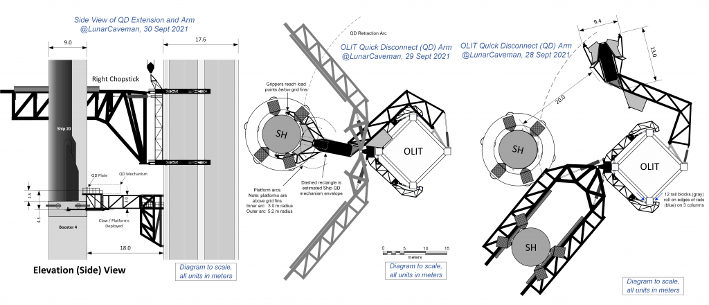 The integration of the QD arm with the Launch Tower began on Oct. 6th, when the ground crews moved the carriage into a vertical position and reoriented the "chopsticks" so they were angled the right way. By Oct. 20th, they completed the first step of installing the carriage and arms onto the rail skates using the facility's largest crane. Twelve connections need to be made in total before the catch arms will be a part of the Tower without the help of a crane.