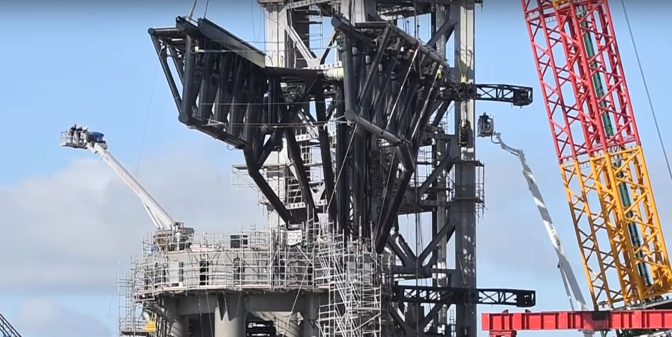Vacuum 6 engines this month, the facility's "Mechazilla" Launch Tower recently received a giant pair of steel arms. Once integrated with the ~135m (~450 ft) tower, these arms will be responsible for "catching" spent Starships and *Super Heavy* boosters as they return to Earth.