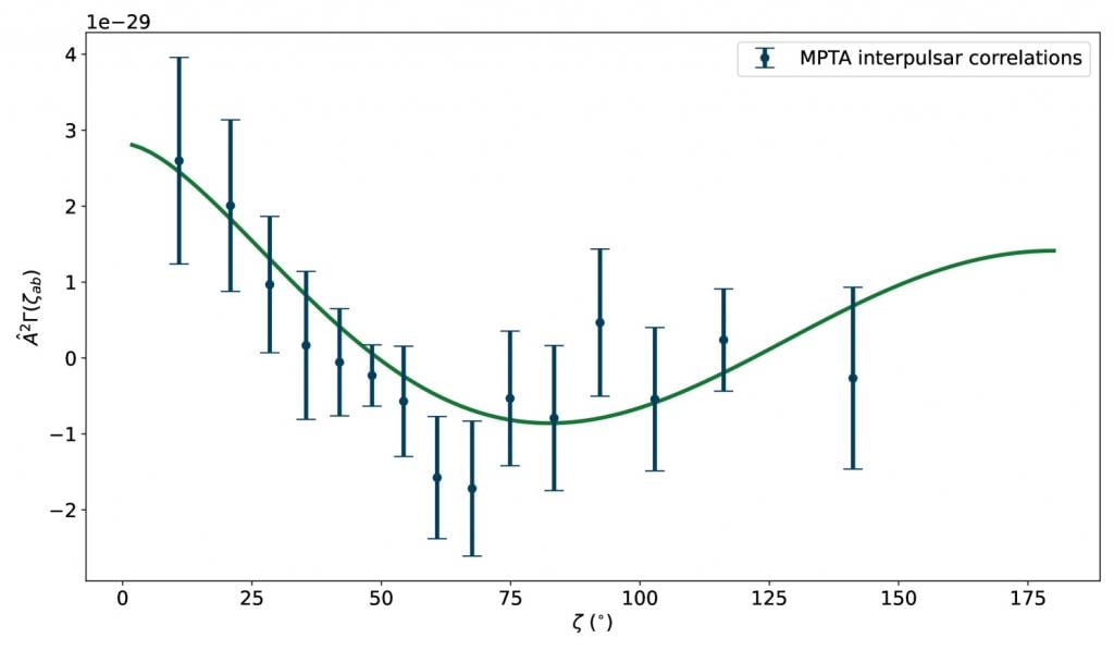 Reference: Miles, Matthew T., et al. " The MeerKAT Pulsar Timing Array: The first search for gravitational waves with the MeerKAT radio telescope." *Monthly Notices of the Royal Astronomical Society* (2024): stae2571.