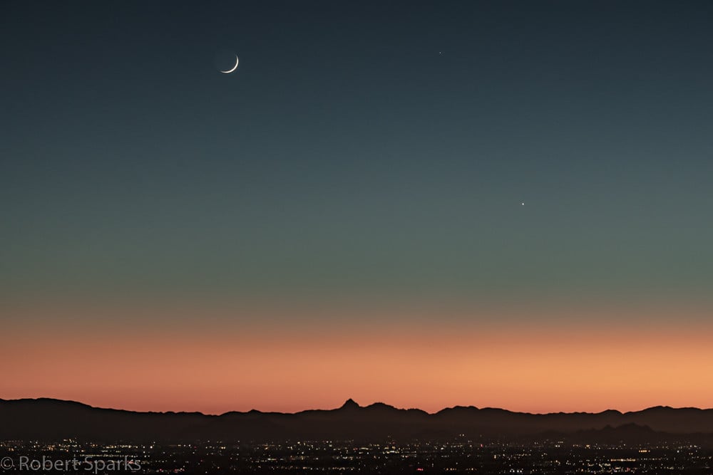 The Moon joins the scene on the evenings of July 7thand July 8thas a waxing crescent. The crescent Moon always adds a three-dimensional look to the scene. This is because the nighttime side is dimly illuminated by the Earth in what's termed Earthshine.
